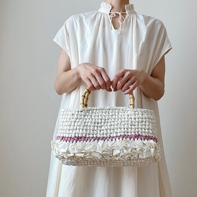 大きな布を、細く手で裂いて編み直した 【布のカゴバッグ】 そのままでは使わない布を、 「裂き編み」という手法で生まれ変わらせた、 このバッグ。 サスティナブルなだけでなく、再販できない 「世界に一つだけ」のものです。 しっかりと編み込み、持ち手にはバンブーハンドルを 使いましたので、じょうぶに仕上がっています。 シンプルながら、 ピンクのラインと、ボトムのフリルをアクセントに、 素敵に仕上がりました。 500mlペットボトルを横向きに入れても、 まだ荷物が入る大きさです。 ・・・・・ ≪素材≫ (本体)綿、麻 (持ち手)竹 ≪サイズ≫ 横30cm 縦18cm(持ち手除く) マチ12cm 重さ470g ≪お手入れ方法≫ 手編みの商品ですので、重いものを入れると 伸びる可能性がありますので、ご注意ください。 汚れた場合は、中性洗剤を含ませた布で ポンポンと叩いたら、きれいな濡れタオルで 再度ポンポンと叩いてください。 持ち手は、濡れタオルで拭いてください。 ≪受注について≫ 同じデザインで、異なる布を使っての製作は可能です。 ご相談ください。