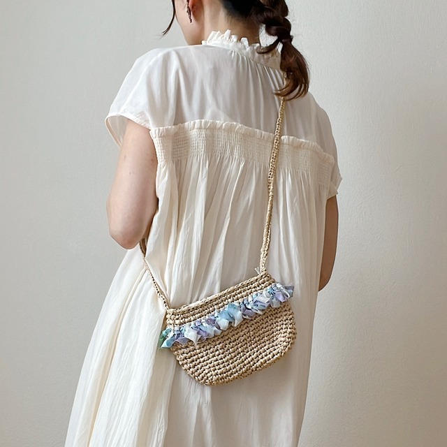 グラデーションのフリルが美しい 手編みの【ポシェット】 本体は手編みで製作しており、 ポイントとしてフリルを編み付けました。 洋服にも使われている美しい麻布を リボン上にカットし、 フリルになるように手編みで取り付けています。 内布付きで、しっかりした作りになっています。 スマホとキーケース、ハンカチが入るくらいの サイズ感です。 .......... ≪素材≫ 本体:レーヨン(エコアンダリヤ)、綿 ≪サイズ≫ 縦 14cm 横 20cm マチ 4cm 重さ 100g ≪お手入れ方法≫ 手編みの商品ですので、重いものを入れると 伸びる可能性がありますので、ご注意ください。 汚れた場合は、中性洗剤を含ませた布で ポンポンと叩いたら、きれいな濡れタオルで 再度ポンポンと叩いてください。 持ち手は、濡れタオルで拭いてください。